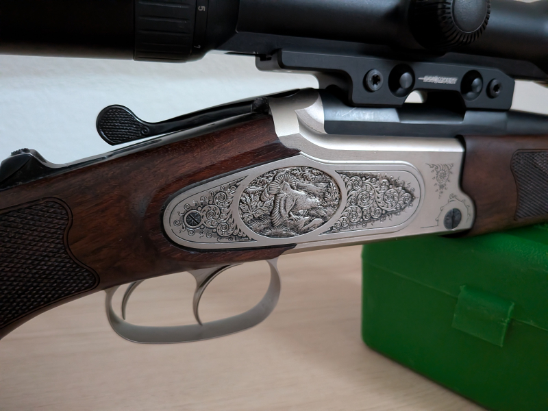 Wunderschöne und luxuriöse Merkel B3 Doppelbüchse im Kaliber 8x57 IS mit langen Seitenplatten, ausgesuchtem Schaftholz und verstellbaren Läufen. Da ich kein Schussbuch führe kann ich die Schussbelastung leider nicht benennen. Eine grobe Schätzung aus der Erinnerung lässt mich zu dem Ergebnis kommen, dass ich mit dem Gewehr ca. 200 Euro Schuss bei der Jagd und beim Training abgegeben habe.