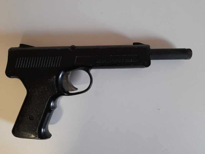 Hergestellt von Milbro (Millard Brothers) in Schottland, und unter vielen Markennamen verkauft, darunter Umarex, Uma, Perfecta. Hierbei handelt es sich um eine Perfecta mit F-Stempel. Hierzulande war sie nicht so verbreitet. Dafür hatten wir unser eigenes Scheusal aus gestanztem Blech mit glattem, wackeligen Lauf: Die Diana LP2. Im Grunde ist die SP50 auch nichts weiter als eine LP2 in neuer Aufmachung: Das System der SP50 ist eingehüllt in einen dicken Rahmen aus Zinkdruckguss. Der liegt immerhin ganz gut in der Hand.