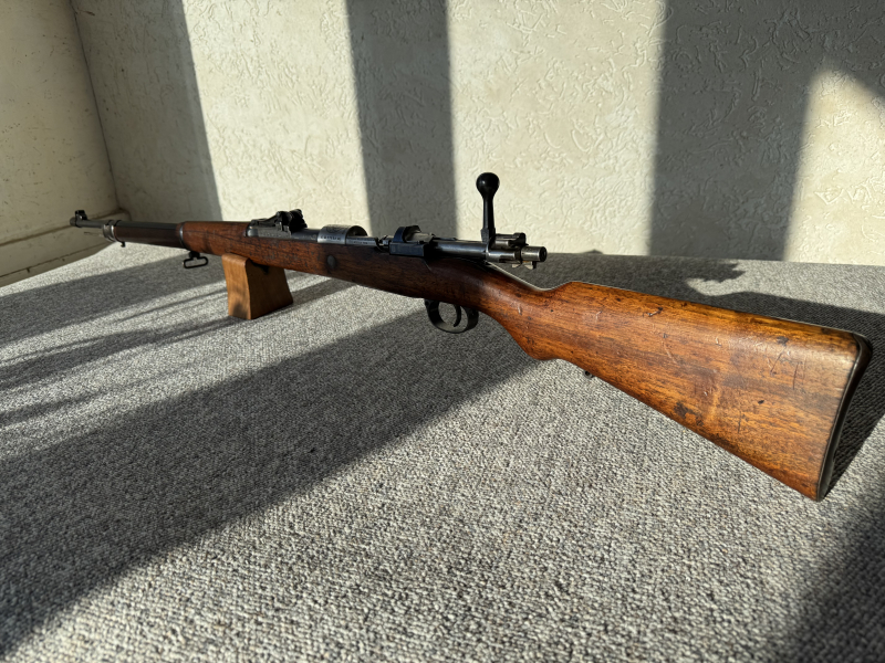 Mauser Gewehr 1909 aus dem Peru Kontrakt. Kaliber 7,65 Arg.Guter Zustand,System poliert ohne Rost.Stoßboden ohne Rostnarben. Schaft, System und Schloss Nummerngleich. Das ist sehr selten,da beim Import die Schlosse und Systeme oft getrennt gelagert wurden.Lauf blank und ohne Rost. Schönes Peruanisches Staatswappenauf dem Hülsenkopf mit Mauser Originalbeschriftung und „Waffenfabrik Mause Oberndorf a/N Modelo 1909 auf der Seite. Mauser Tonne auf dem Schaft.Eines der schönsten südamerikanischen Mauser Gewehre in erstklassiger Vorkriegsqualität und ein Stück Zeitgeschichte. Verkauf im Auftrag.