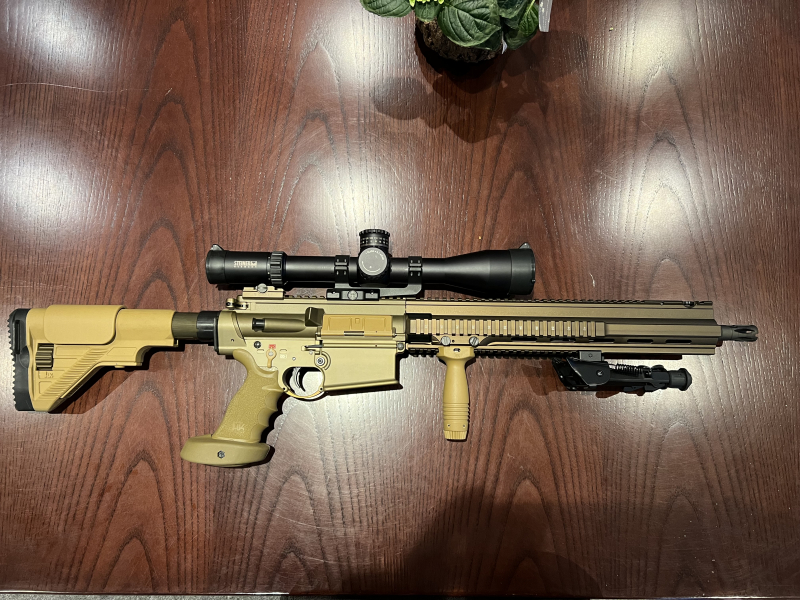 Verkaufe eine Heckler und Koch MR308 in der G28 Variante mit einem Steiner Military 4-16 x 50 Glas. Das Gewehr wurde ursprünglich zum sportlichen schießen angeschafft. Da der heimische Schießstand aber die Joule Zahl begrenzte, sind vielleicht 50 Schuss damit abgefeuert worden. Als Zusatzausstattung ist ein Frontgrip sowie die HK eigene Präzisionsgriff sowie ein Walther BiPod zugefügt worden. Der Originalgriff ist ebenfalls beigefügt. Der Waffe liegt das original 10 Schuss Magazin bei. Die Waffe hat ein versenkbares Kimme und Korn. (Notvisierung) Farbe RAL8000. Lauf 16,5 Zoll. Kommt im original HK Langwaffenkoffer.