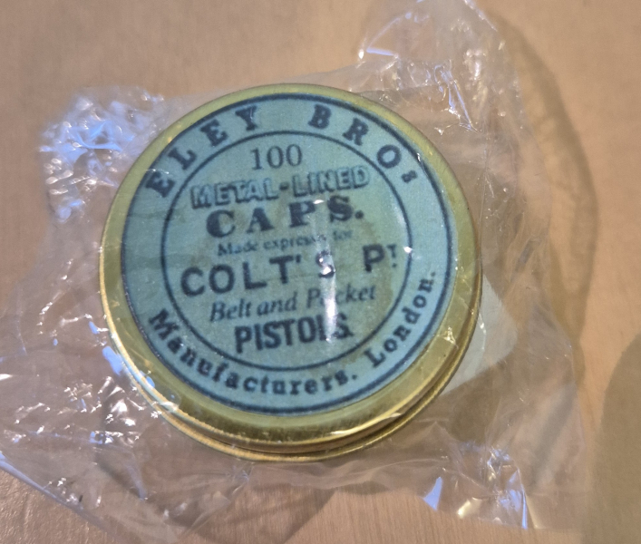 Colt Zündhütchendose mit der Beschriftung der Eley Brothers London. Die Dose ist absolut neuwertig und noch in der Originalverpackung