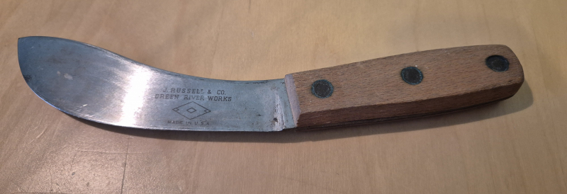 Skinner Knife von J. Russel & Co Green River Works. Das Messer ist nur sehr wenig gebraucht worden und in einem sehr guten Zustand. Es hat lediglich durch lange Lagerung etwas Flugrost angesetzt. Die Klinge ist ca. 13 cm lang und die Gesamtlänge ist etwa 22,5 cm.