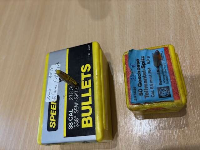 Verkaufe 50 Geschosse RWS Teilmantel Spitz .264 6,5mm 6,0 Gramm sowie 91 Geschosse 6,5mm, alle gewogen 139gr. Hier ist der Hersteller und die Geschossart unbekannt.