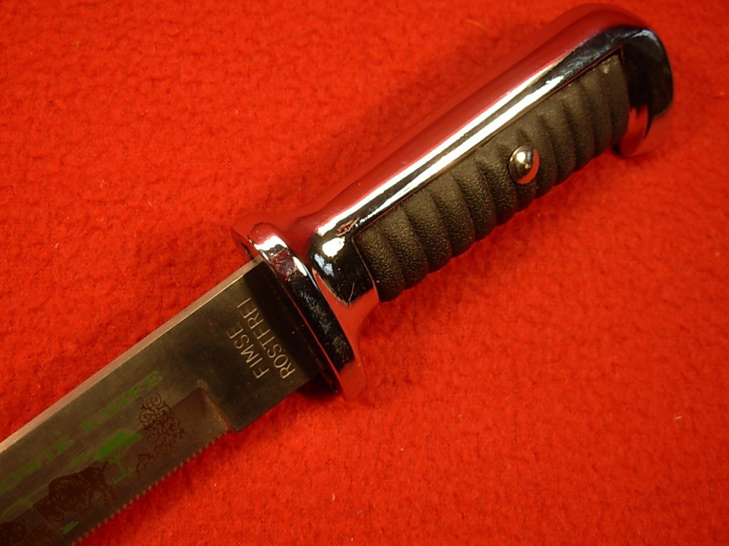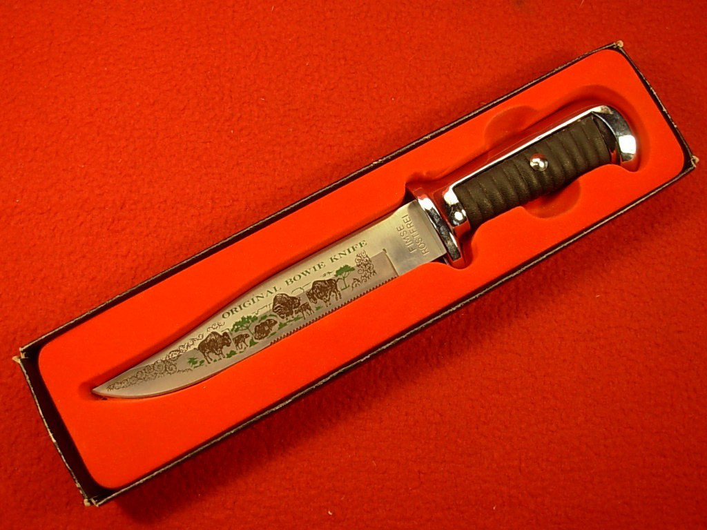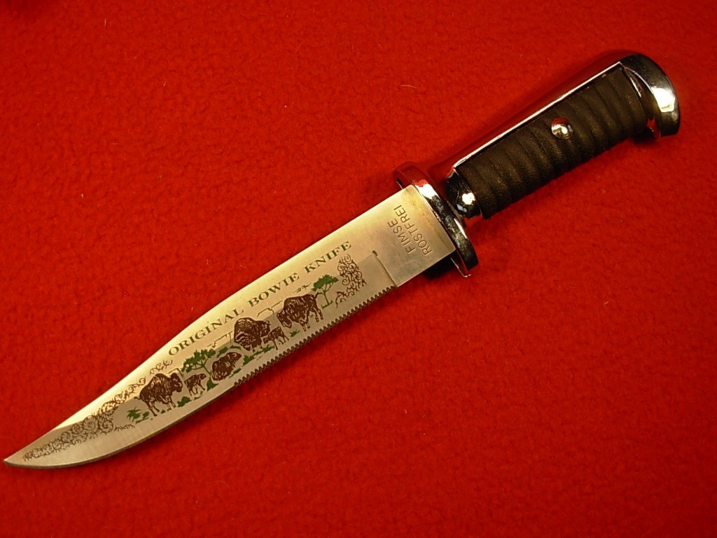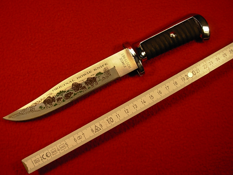 Bowie Messer – Klinge mit Sägezahnung – mit Büffel Motiven verziert –