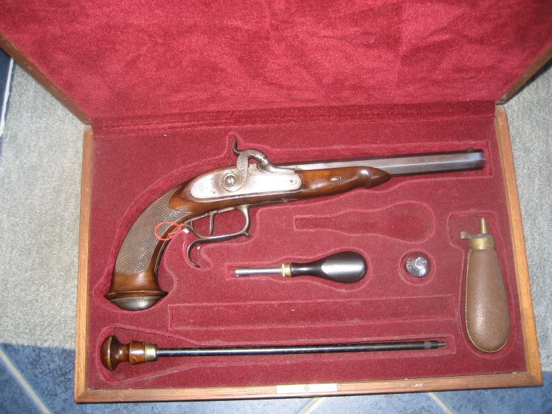 biete eine schöne Pistole Le Page im Kal. .44 BP von "Neumann Pedersoli" im "Antikfinish". Das Ganze dazu noch in einem Kasten im "französischem Stil". Ich konnte leider nicht herausfinden, ob das von Neumann so herausgegeben wurde, oder ob der Vorbesitzer die Le Page hat künstl. altern lassen. Gültiger ital. Beschuss von 1981. Pistole im sehr gutem Zustand, Schloß rastet 2x , Rückstecher funktioniert, Lauf gezogen. Der Kasten ebenfalls sehr gut, ohne grobe Kratzer oder Brüche, Ladestock, Pistonschlüssel, kleine Öldose und Pulverflasche neuwertig bis fast neuwertig. Es fehlen der Schlüssel und der Schraubendreher. Der Kasten mit seinem Interrieur wäre allein schon 150€ oder mehr wert. Dazu dann die Pistole. Ich habe es nicht übers Herz gebracht, das einzelln zu versteigern. Ich starte daher hier mit 222€. Privatverkauf, keine Garantie oder Rücknahme. Bilder sind Bestandteil des Angebotes. Falls sie einen Sofortkauf wünschen und noch keiner geboten hat, machen sie mir ein Angebot. Bitte beachten sie auch meine anderen Auktionen.