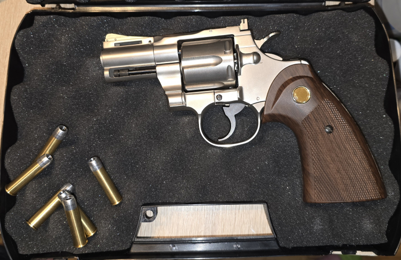 Hallo, biete hier eine King Arms .357 Python in 2,5 zoll, 6mmBB, Gas an, in schwarz. Die waffe hat kein Blowback, hat keine gebrauchspuren, waffe ist aus Metall, sie ist dicht und hat ein F zeichen. Mit dabei ein Waffenkoffer, 6 patronenhülsen. Was aussieht wie Flecken auf der waffe sind nur Öl Spuren von der Pflege. Waffe ist nur probe geschossen, zwecks funktion und Dichtigkeit.