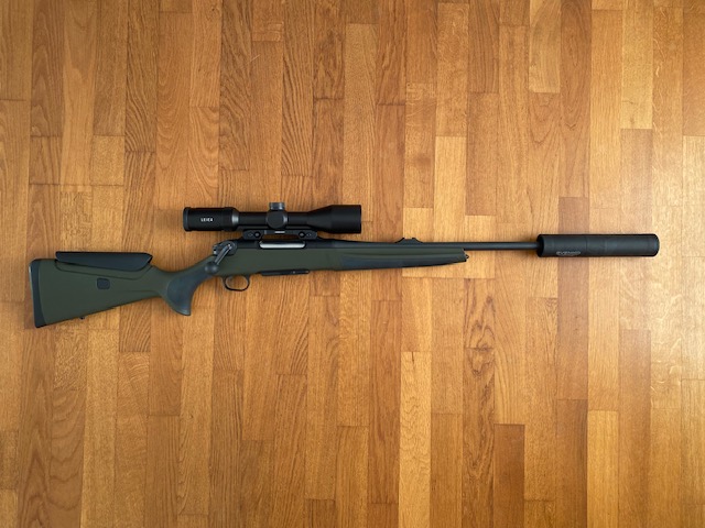 und Schalldämpfer Svemko mit Quick Mount Adapter. Ein optimales Starterset für Jungjäger. Eingeschossen und genutzt wurde die Waffe mit Geco Start 10,7g. Die Abgabe erfolgt auf Grund eines beruflichem Umzugs.