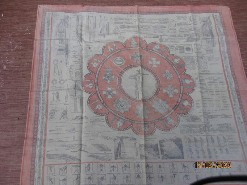 Aus einem Sammlernachlaß gebe ich dieses bedruckte Baumwollholztuch in die Auktion. Alter und Verwendungszweck sind mir unbekannt, daher ohne Obligo für einen Euro eingestellt. Größe: 60 x 60cm, einseitig bedruckt mit Zerlegeteilen des Gewehrs 88, militärischen Dienstgraden und Orden sowie Anschlagsarten mit dem Gewehr. Sehr dekorativ. Die Farben sind altersmäßig verblaßt s. Foto. Unversicherter Versand, auf Wunsch gerne höhere Versandkosten.