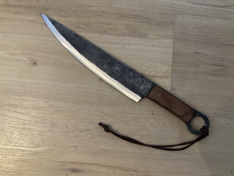 Ich biete hier ein keltisches Ringknauf-Messer, handgeschmiedet aus Kohlenstoffstahl. Sehr scharfe, massive Klinge (Klingenrücken ca. 5mm), Gesamtlänge ca. 50 cm. Ein großes Arbeits- und Haumesser. Griffschalen verklebt und vernietet aus Walnussholz, robuste Scheide aus Echtleder mit Gürtelschlaufe. Unbenutzt und intakt. NP zusammen 80 Euro (Da dies ein privater Verkauf ist, gewähre ich keine Garantie und kein Rückgaberecht (siehe EU-Recht).