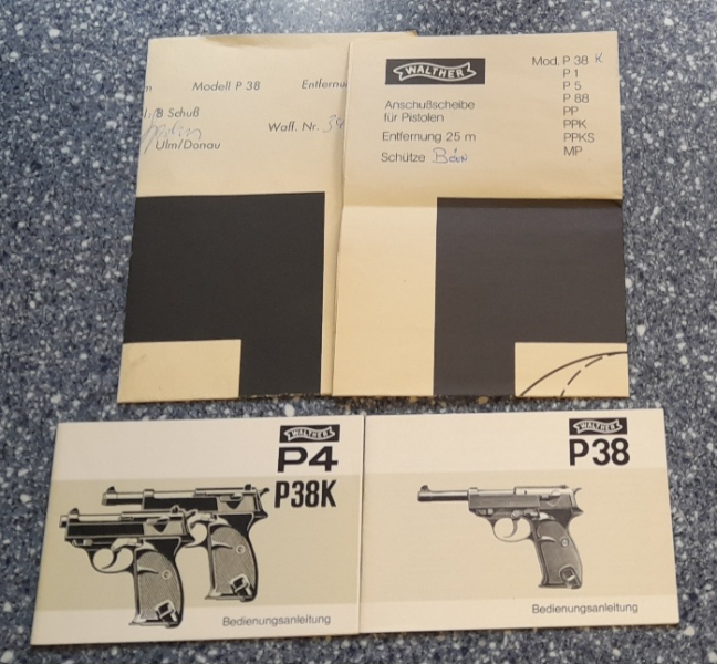 angeboten ist ein Konvolut aus zwei Anschußscheiben und zwei Bedienungsanleitungen Walther P4 und P38