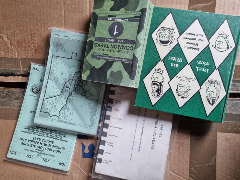 Bücher unterschiedlicher Themen, Militärwitze, US "Reibert" Taschenbuch, Flugdaten Instruktion f. Piloten, Engineer Field Data f. Army - FM5-34. In Dt. und Engl. Sprache. Gebraucht, teilweise in Folie verpackt.