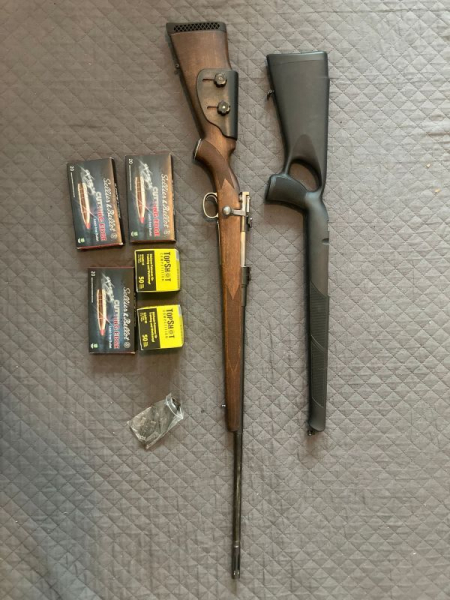 Die Waffe kommt mit drei Schäften: einem schwarzen Kunststoff Lochschaft und einem Holz Jagdschaft mit verstellbarer Backe. Aktuell ist ein Timney Abzug mit seitlicher Sicherung verbaut, der Orginalabzug sowie ein paar andere Teile liegen bei, als Montage sind zwei Picatinnybasen vorhanden.