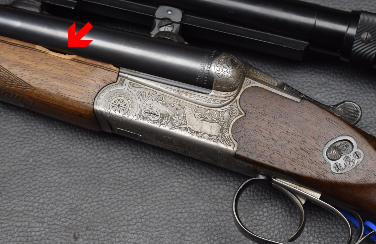 Läufe sehr gut, Brünierung 96%, Schaft gut, leider kleiner Ausbruch am Vorderschaft,
