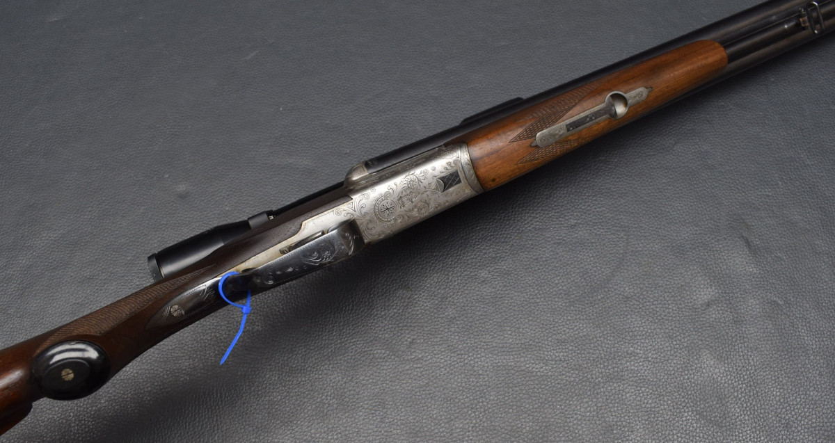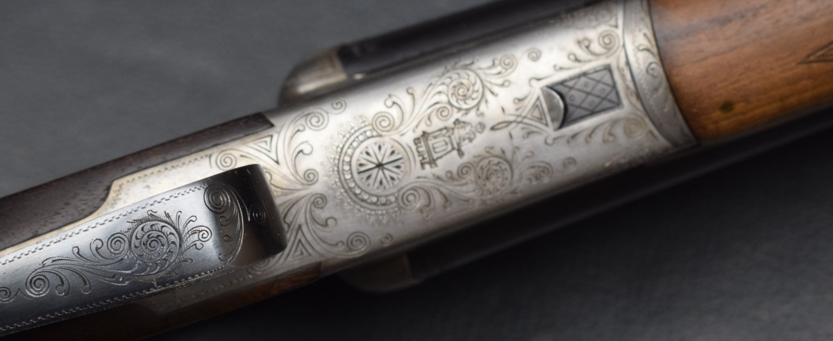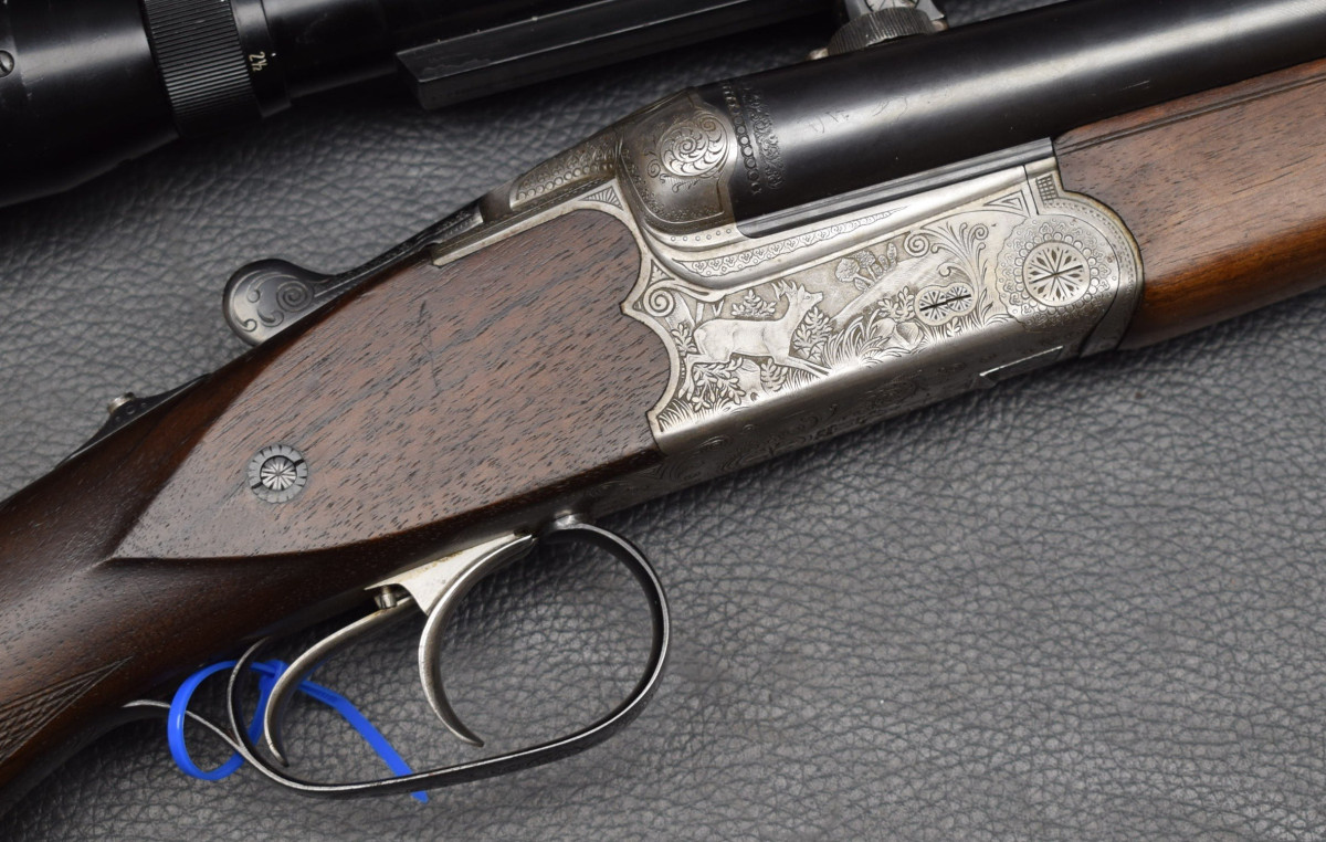 gravierte Stahlbasküle, brünierter gravierter Abzugsbügel, seitliche Schiebesicherung,