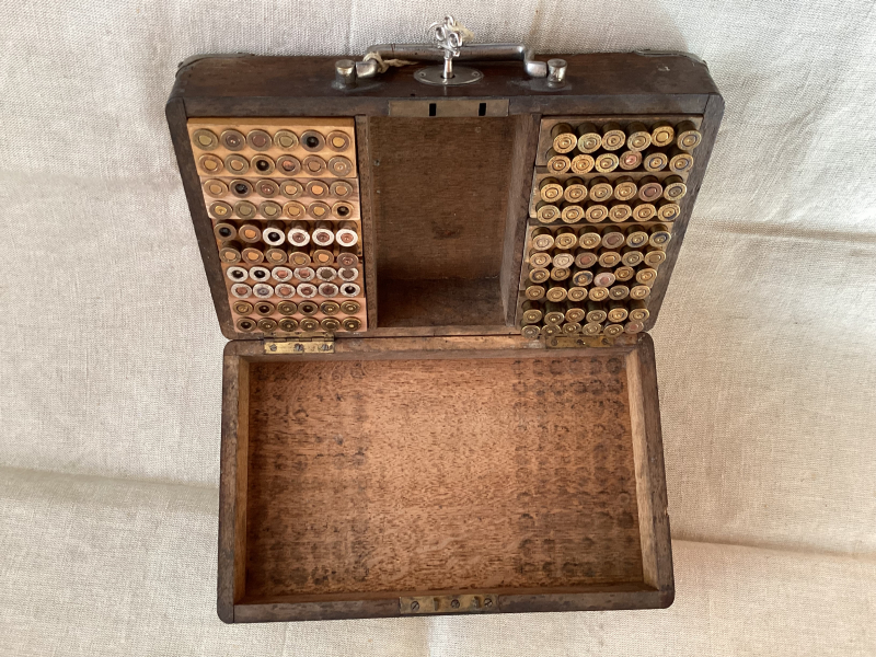 Der Koffer ist aus Eiche, eine solide alte Handarbeit. Die Hülsen sind hauptsächlich von G Roth, sind aber auch Hirtenberger und RWS dabei. Alle Hülsen in den alten Klötzen.