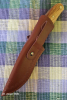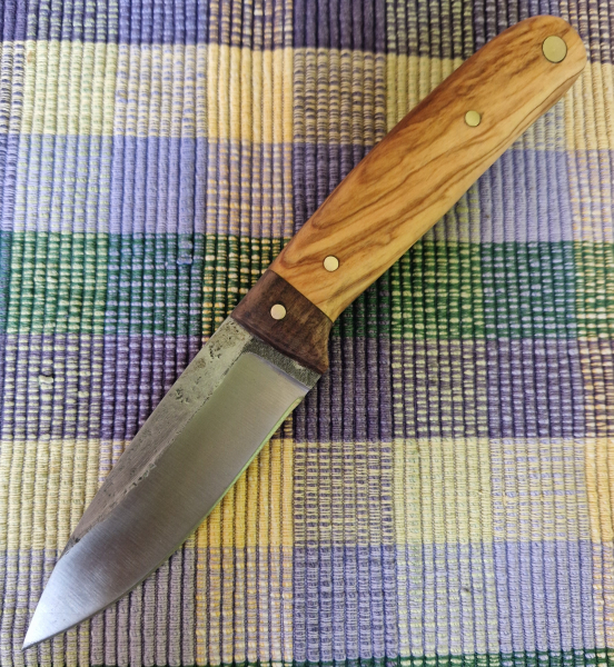 Klinge Carbonstahl, 1095 764 EA, 56 - 58 HRC, nicht rostfrei. Ursprünglicher Zustand der Klinge bei Lieferung (s. Bild), überarbeitet und poliert. Griffmaterial Oliven- und Nußbaumholz. Dazu passende Messerscheide, punziert (Internetkauf!)