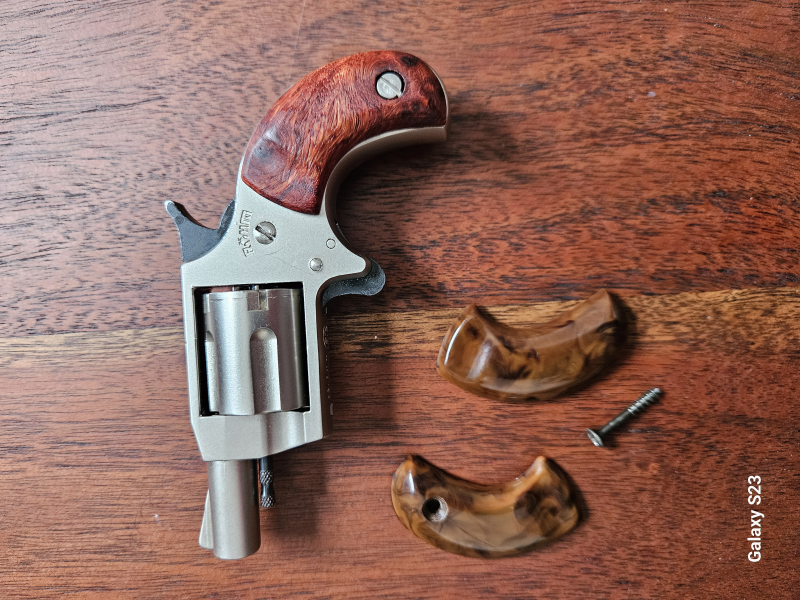 Zur Versteigerung kommen die auf den Fotos abgebildeten originalen Griffschalen (mit Schraube) eines Little Joe Derringers / Revolvers von Röhm, Cal. 6 mm Flo. Pl., PTB 349.