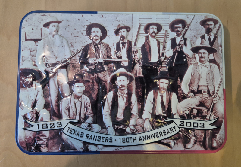 Texas Ranger Commemorative Messer von Smith & Wesson zum 180. Jubiläum der Texas Ranger. Das Messer ist absolut neuwertig und unbenutzt, lediglich die Dose hat am Boden eine kleine Delle an einer Ecke. Das Messer wurde 2003 von S&W auf den Markt gebracht, es ist von der Taylor Cutlery für S&W gefertigt worden. Es hat eine ca. 9cm lange Klinge, die Gesamtlänge ist ca. 21 cm. Der versilberte Ranger Stern hat einen Durchmesser von ca. 4,5 cm.