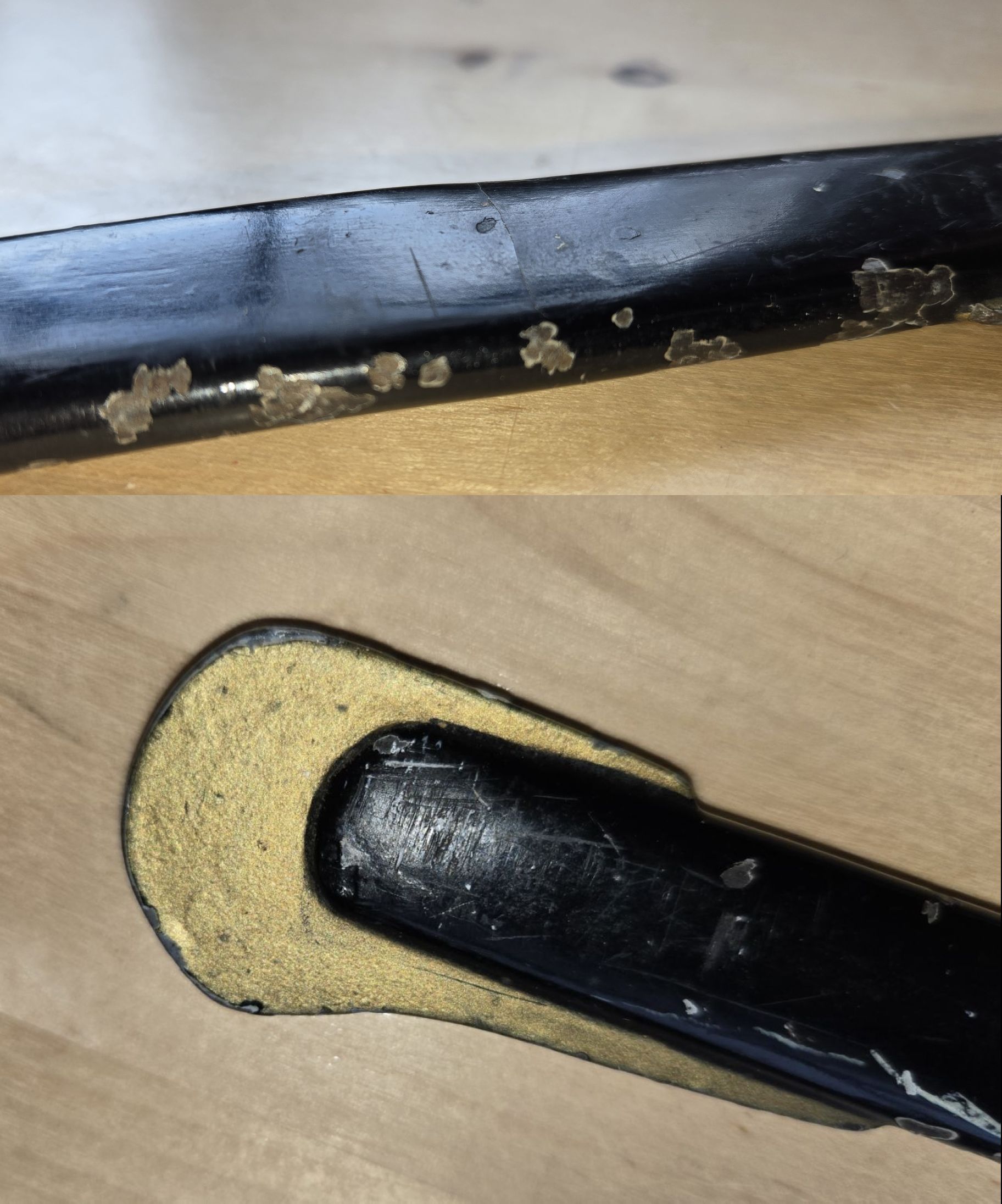 Die Waffe ist gebraucht, die Ziselierung/Ätzung ist teilweise erkennbar (Kanonen/Trophäen Lanzen), die Griffwicklung ist vorhanden, aber an einer Stelle gebrochen. Die Scheide hat eine Knickstelle, scheint gerichtet und teilweise überlackiert.