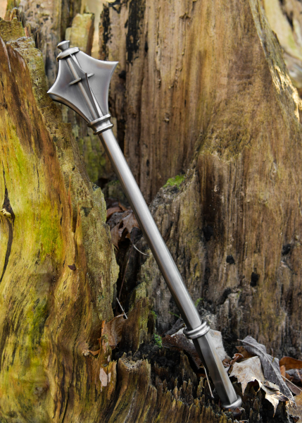 Der Streitkolben ist ausschließlich aus Stahl gefertigt und besitzt am Kopf sechs spitz zulaufende Schlagblätter, sogenannte Flügel. Das Original unserer Nachbildung befindet sich heute im Britischen Museum in London. Bei unserer Replik handelt es sich um eine Dekorationswaffe, welche nicht für den Schaukampf geeignet ist.