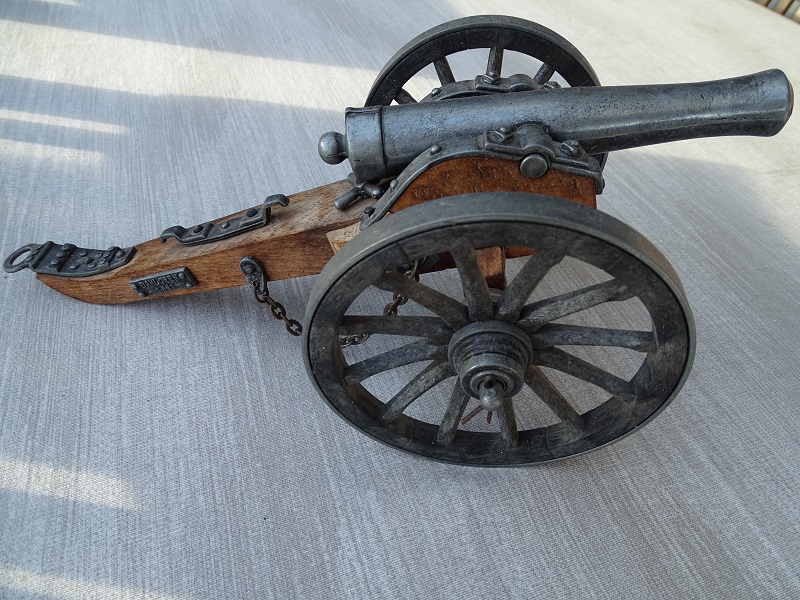Sehr schöne Modellkanone Dahlgren 1861. Gesamtlänge 30 cm, Rohr 15 cm lang, Raddurchmesser 113 mm, Gewicht 0,6 kg, Räder sehr aufwendig gefertigt, Höhe 12 cm. Fragen per e- mail, keine Garantie und Rücknahme.