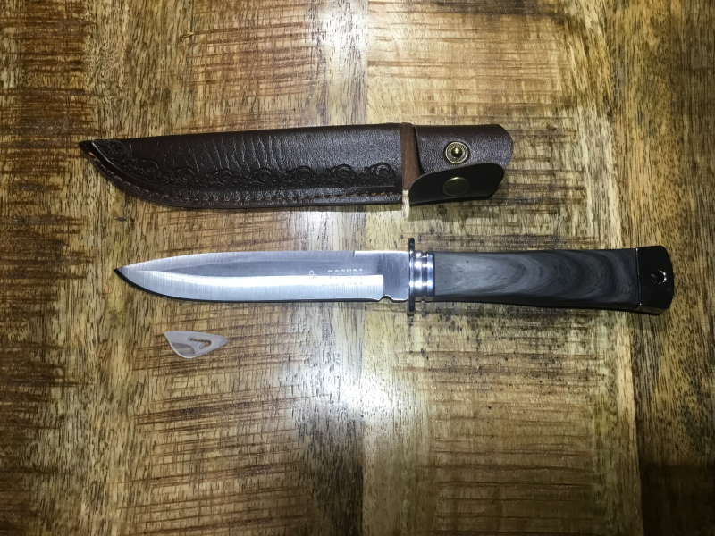 Ich biete ein schönes Messer an,es macht einen unbenutzten Eindruck.Die Klinge hat eine Länge von ca 14 cm mit dem Zollstock gemessen,sie macht einen scharfen Eindruck.Die Gesamtlänge beträgt ca 26 cm.Dabei ist die dazugehörige Scheide.