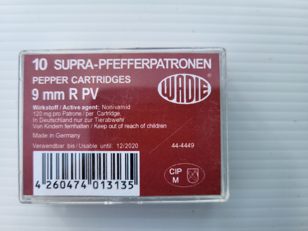 Sie kaufen eine Packung (10 Stück) Wadie SUPRA-Pfefferpatronen im Cal. 9mm Revolver, abgelaufen 12/2020, Extrem Stark geladen.