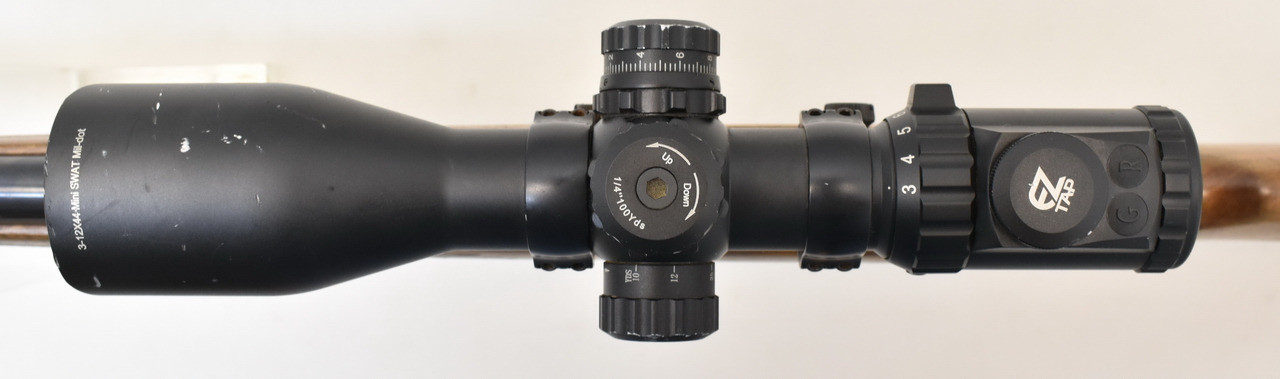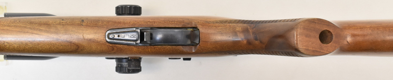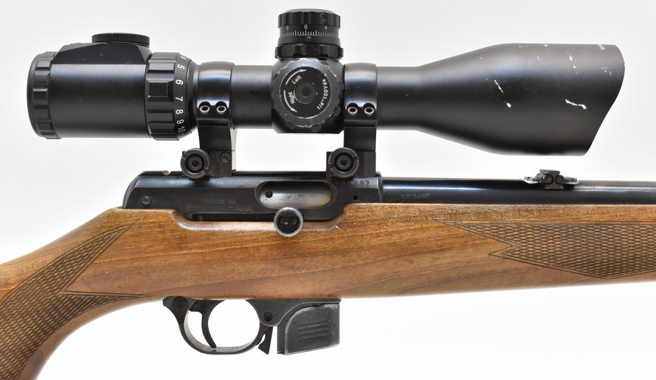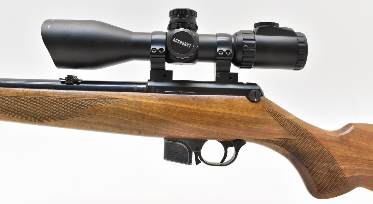Selbstladebüchse des tschechischen Herstellers CZ Uhersky Brod. 5-Schuss Magazin, montiert mit einem Accushot ZF 3-12x44 Mini Swat. Der Lauf ist matt und narbig, außen auch partiell Rostnarben. Schaftlänge 35,5cm ( gemessen Abzug bis Mitte Schaftkappe) Beschuss von 1970.