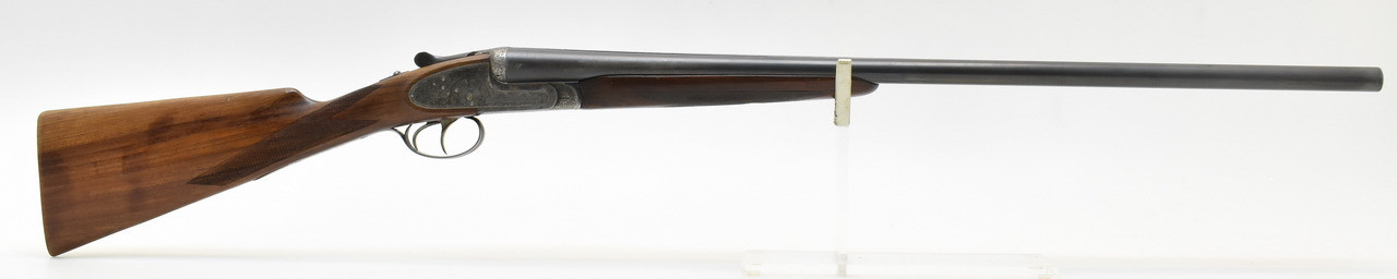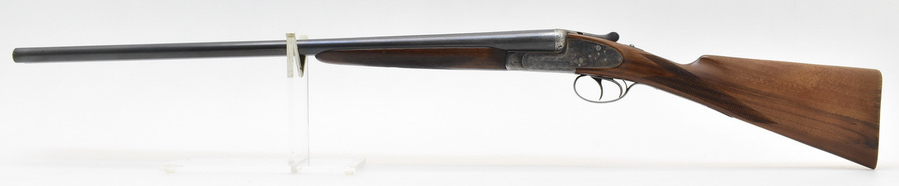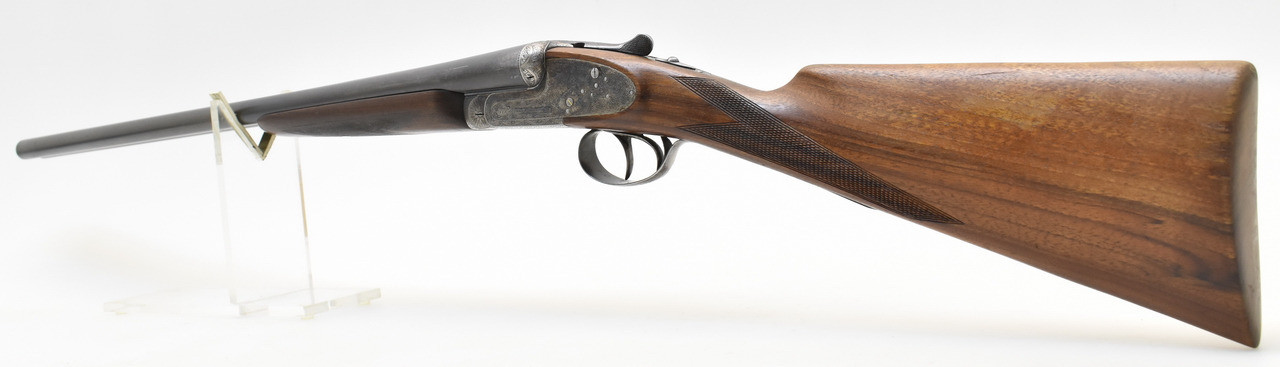 Elegante Flinte mit Doppelabzug und Ejektor. Halb/viertel Choke, Sicherungsschieber auf dem Kolbenhals. Die Brünierung ist stellenweise berieben. Spiegelblanke Läufe, der Verschluss ohne Spiel. Schaftlänge 35cm ( gemessen vorderer Abzug bis Mitte Schaftkappe)