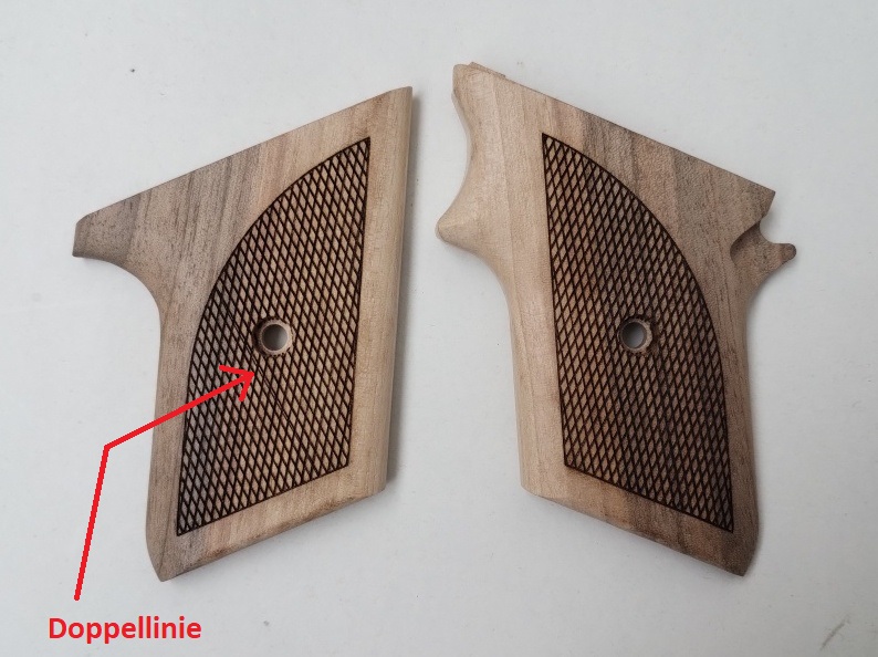- Doppellinie im Lasermuster auf der rechten Griffschale, siehe Foto.
