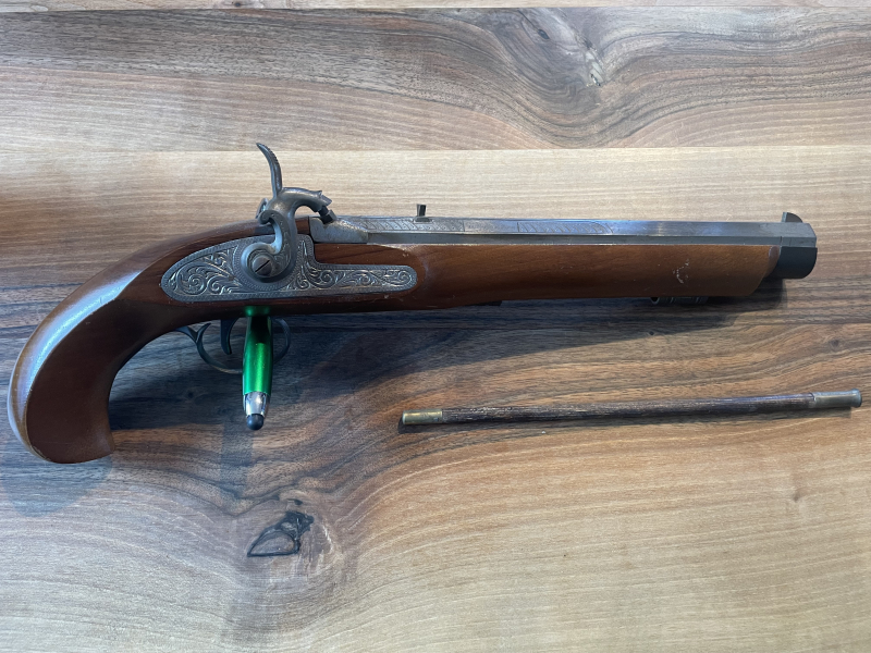 Verkaufe eine Vorderlader Perkussionspistole des Herstellers ,,Jacobi Iserlhon MS 11233“ im cal.45 aus einem Nachlass. Die Pistole hing Jahrelang zur Deko an der Wand und hat daher auch die ein oder andere Schramme am Schaft (siehe Bilder) und leichten Flugrost am Lauf. Soweit ich es beurteilen kann wurde mit der Waffe nie geschossen, keine Schwarzpulverrückstände im Lauf und am Piston. Beschusszeichen am Lauf und Seriennummer vorhanden. Die Laderaste funktioniert und der Hahn schlägt auch trocken ab. Der Ladestock ist ebenfalls mit dabei. Maße: Gesamtlänge 40cm, Gesamthöhe 14cm