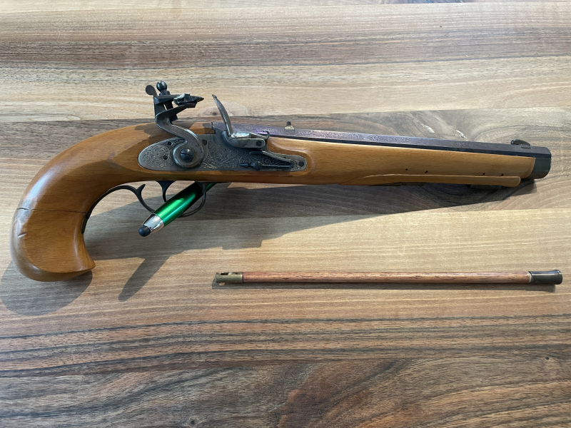 Verkaufe eine Vorderlader Steinschloßpistole des Herstellers ,,Pedersoli“ im cal.44 Made in Italy aus einem Nachlass. Die Pistole hing Jahrelang zur Deko an der Wand und hat daher auch die ein oder andere Schramme am Schaft (siehe Bilder) und leichten Flugrost am Lauf. Soweit ich es beurteilen kann wurde mit der Pistole aufgrund Verfärbung an der Brünierung und Schwarzpulverrückständen am Zündmechanismus auch irgendwann mal geschossen.