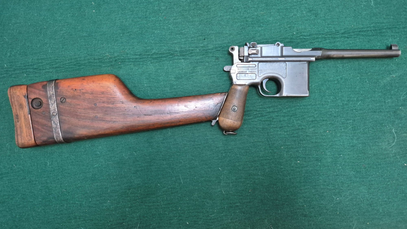 Halbautomatische Pistole Kal. 7,63 Mauser, C96 Mauser Oberndorf, mit Anschlagschaft, nummerngleich bis auf Anschlagschaft, jedoch gleiche Einheit. Lauf blank