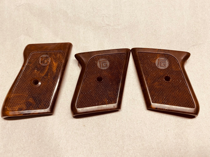 Braune Kunststoffgriffe passend für Röhm-Gaswaffen. Für Modell RG 9 und eine rechte Griffschale RG 800, die nie verwendet wurden, liegen schon lange im Schrank.