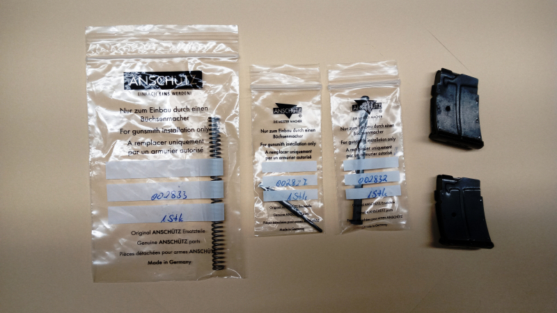 Vorab!! Kein Verkauf ins Ausland!! Zum Erwerb steht ein Konvolut von Ersatzteilen bestehend aus 2 Fünf-Schuss Magazine, Schlagbolzenfeder (002833); Zündstift ( 002832 ) und Zündstift ( 002827 ) für Anschütz KK-Repetierbüchsen im Kaliber .22 LfB.. Teile passen laut Anschütz in den Modellen 1416, 1516, 1517 und 1903. Keine Garantie oder Rücknahme da Privatverkauf!