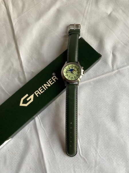 Greiner Jagduhr, Mondphasenuhr mit Datumsanzeige , fluoreszierendes Zifferblat und Zeiger, grünes Lederarmband, die Uhr wurde nie getragen, absoluter unbenutzter Zustand.
