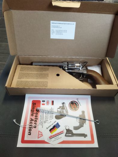 Verkaufe einen meiner beiden Western Single Action Revolver Kaliber 9 mm R Knall PTB Nummer 883 Hersteller WEIHRAUCH mit neuwertig erhaltenen Original Karton, Beschreibung und Reinigungsbürstchen. Laut Auskunft von Weihrauch Mellrichstadt wurde das im Moment nicht mehr zu bekommende und nicht mehr produzierte Schmuckstück 2012 hergestellt. Erkennbar an der Nummer A3192 mit der silbernen Ätzung. Der Griff hat zwei ausgesuchte Holzschalen. Trommel und Lauf aus Stahl, alles noch original verchromt. Trommel für 6 Schuss und ist voll funktionstüchtig und für mich in sehr sehr guten bis neuwertigen sammelwürdigen Zustand, da nur sehr wenige Schüsse damit abgegeben wurden. Bei Fragen bitte melden. Privatauktion, daher übernehme ich keine Rücknahme und Garantie. Ich verschicke DHL versichert innerhalb von Deutschland. In die EU Hermes versichert für 25.- Euro.
