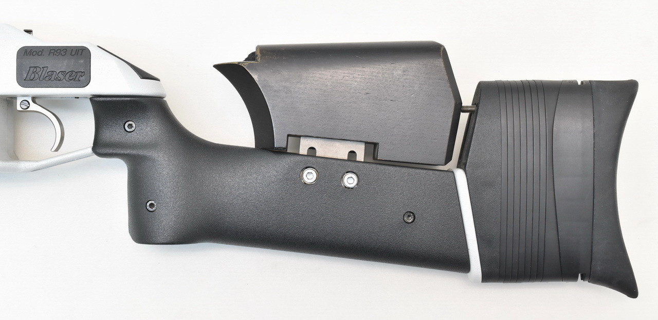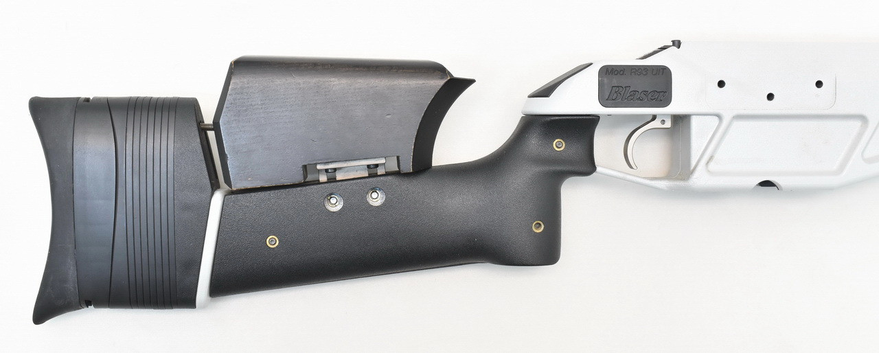 mit schwarzen Anbauteilen für Rechts- und Linksanschlag. Einstellbarer Blaser Kompaktabzug.