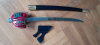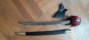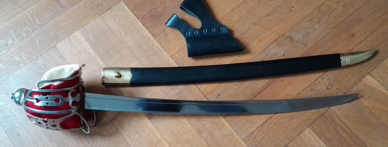Ein ganz toller Entersäbel, die Kombination einer Windlass-Klinge aus 1065 Kohlenstoffstahl mit dem Gefäß eines Hanwei-Broadswords. Mit abgebildeter Lederscheide und Trageschlaufe aus Echtleder. Seiner Zeit erworben von Heiko Große, dem Leiter der Broadsword Academy Germany. Wirklich ein besonderes, äußerst führiges und insgesamt einfach beeindruckendes Stück, das ich nur ungern wieder abgebe. Die Klinge ist steif und dennoch flexibel, das Schwert mit ca. 1330 g Gewicht und einem Balancepunkt von ca. 6 cm vom Parier äußerst führig. Die Klinge verjüngt sich von 5,7 mm am Korb auf 2,9 mm an der Spitze. Ein hervorragendes Kampfschwert und definitiv Schnittest-geeignet. Ich habe den Griff mit Tennisgriffbändern umwickelt, diese können problem- und rückstandslos entfernt werden. Allerdings verbessern sie die Handhabung, da die Rochenhaut des Hanwei-Griffs ohne Handschuhe auf Dauer doch etwas unangenehm werden kann. Ich würde sie für den Käufer daher noch dranlassen. Die Klingenlänge beträgt 65 cm, die Gesamtlänge des Säbels ohne Scheide 81 cm.