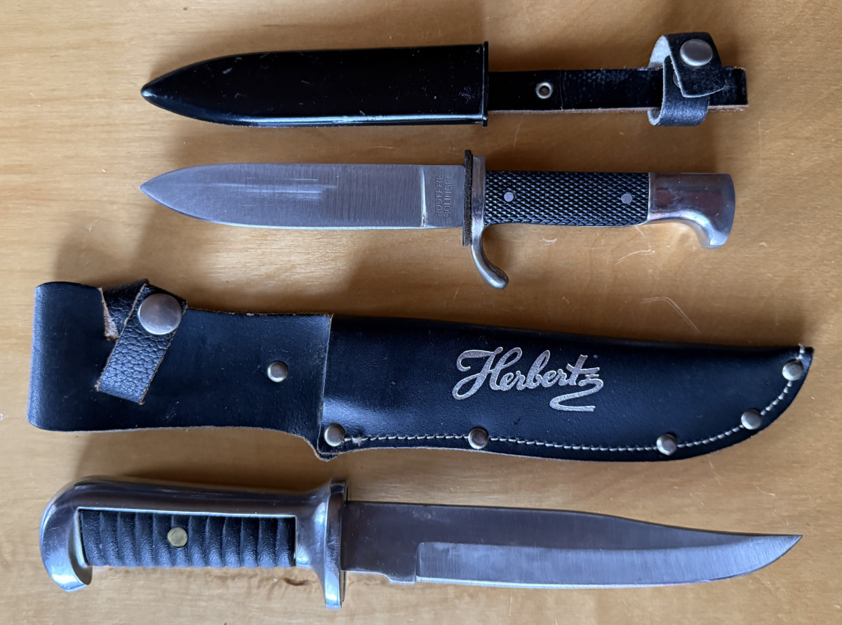 zwei feststehende Messer, ein Fahrtenmesser, ein Bowiemesser von Herbertz