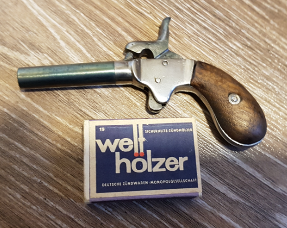 modell derringer verkleinert,länge ca.120mm zum überarbeiten an bastler.magnetisch holzgriffschalen schlossfunktion gegeben ohne beschriftung,alter und herkunft unbekannt nicht schussfähig !.privatverkauf,keine garantie,keine rücknahme.nur mit deutscher lieferadresse,keine inseln.bitte mygun beachten !