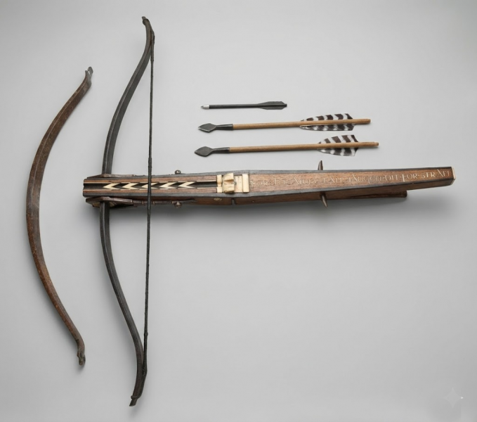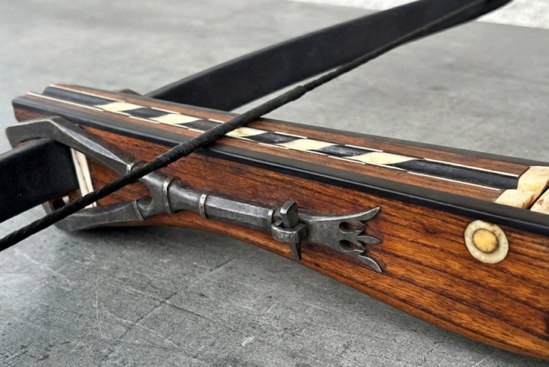 Die Armbrust ist aus Holz mit geschmiedeten Elementen.