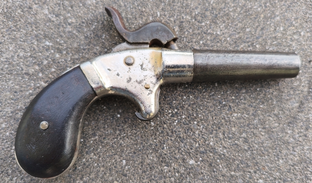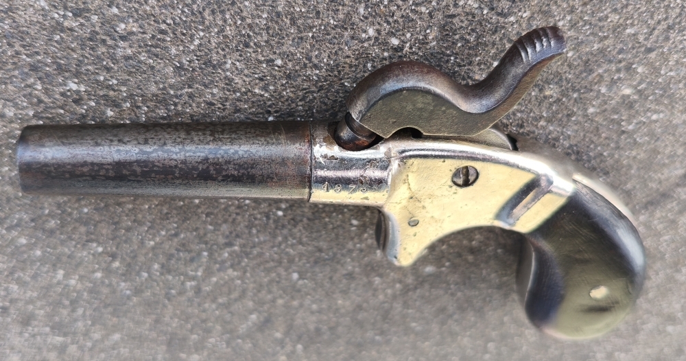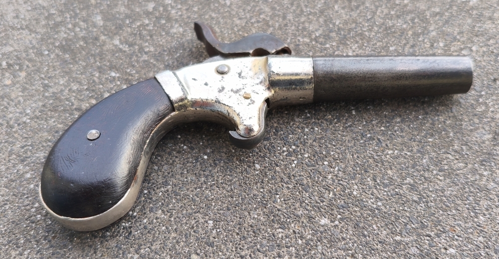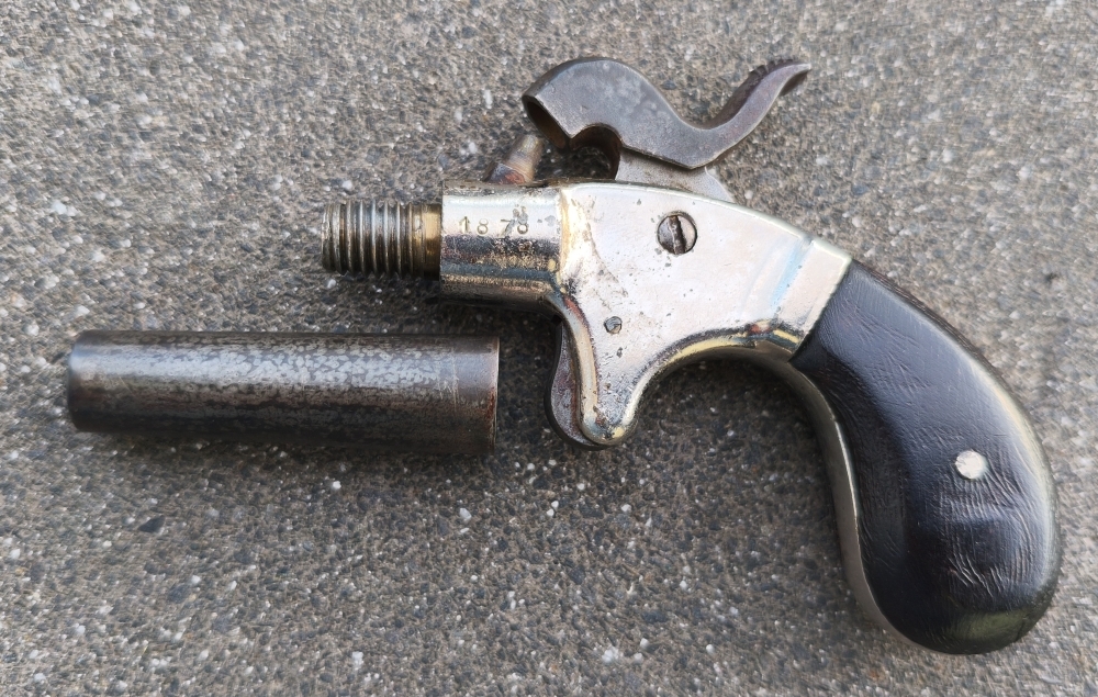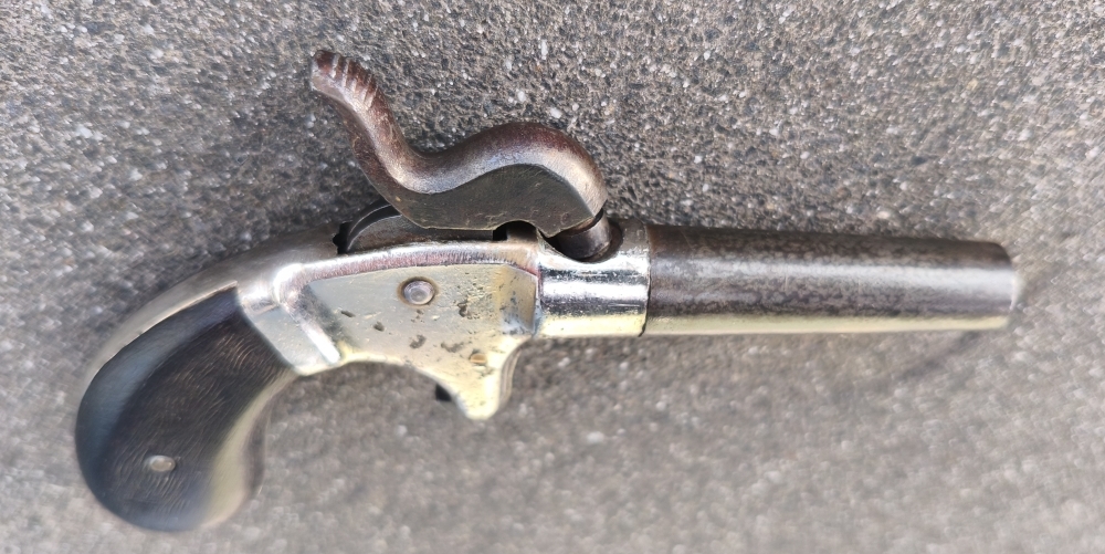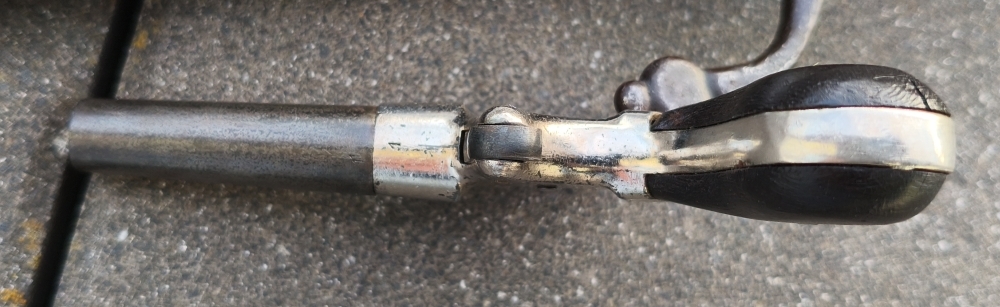 Vernickelter Systemkasten, seitlich 1878, auf Lauf und Rahmen gestempelte Nummer 1, zwei Rasten. Vernietete Griffschalen. Gesamtlänge 13,3cm.