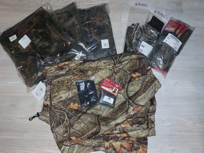 Tarnbekleidung 3x Set bestehend aus Jacke und Hose, 2x Hose separat, Handschuhe 12 Stück und Gesichtsmasken 2 Stück