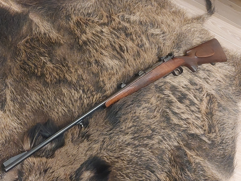 Zum Verkauf kommt einer 98er Büchsemacherumbau aus den 50er Jahren im Hochleistungskaliber 8x64S. Die Waffe besitzt eine großflächige Eichenlaubgravur auf System und Magazinkasten, welcher mit Klappdeckel ausgeführt ist und mittels Schwenkriegel nach alter Mauserart zu öffnen ist. Der Verschluss und der Magazinzubringer sind mit Sonnenschliff versehen, der Abzug besitzt einen Rückstecher. Die Lauflänge beträgt ca. 65cm, der Hinterschaft ist ca. 36cm lang. Auf der Waffe befinden sich SEM Sockel. Patronen wären bei Bedarf auch verfügbar.