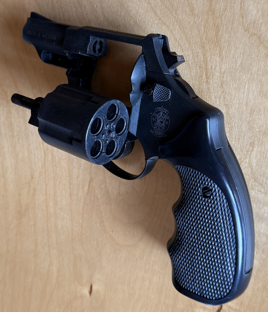 Technisch ist der Revolver in Ordnung, bis auf den abgebrochenen Hahn, müsste halt mal ein neuer dran. Schießen geht aber.