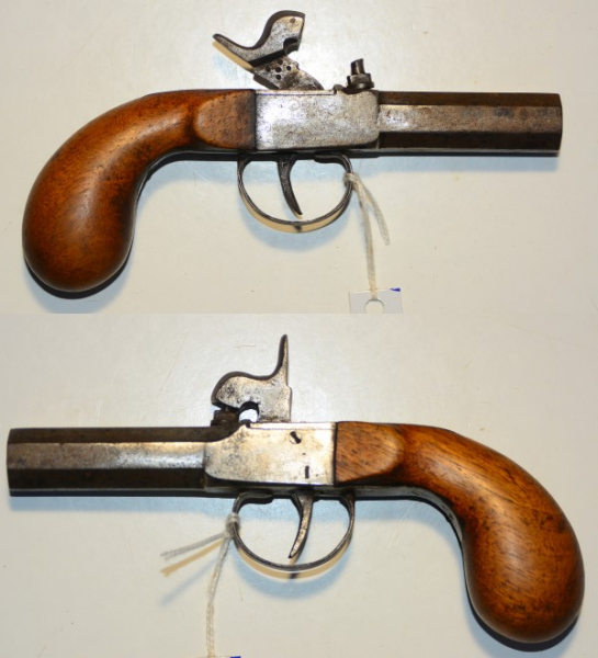 Perkussionspistole aus Frankreich, Terzerol mit starrem Lauf, Lauflänge 66 mm, Gesamtlänge 16,7 cm, Kaliber 11mm, guter Zustand mit Alterspatina, technisch in Ordnung