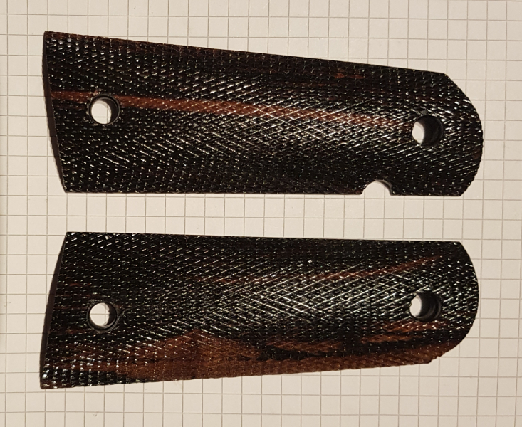 Sie bieten hier auf ein paar ( li.+re. ) Griffschalen für Colt 1911-er und baugleiche pistolen. Neu und unbenutzt. Hartholz und Checkering. Lackiert. Beide griffschalen innerseits Nr." 7" eingeprägt. Es handelt sich um exakt die Griffschalen die auf dem Bild zu sehen sind. Photo am tageslicht gemacht daswegen schatten zu sehen. Quadratische Hintergrund = 5 mm Raster. Weitere Fragen, bessers Bilder etc. gerne jederzeit per Anfrage hier. Versand per DHL mit Send.Nr. oder auch nach Wunsch. Mfg.