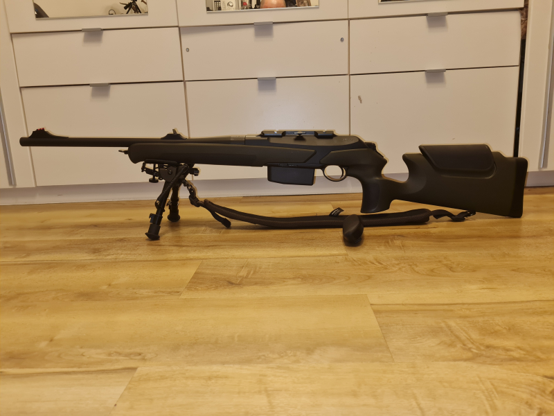 Die Büchse kommt mit 2 Schaftkappen, Dentler Grundschiene und 5 Schuss Magazin.
