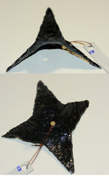 Original Krähenfuß von der Westfront des 1. Weltkriegs, ca. 67 mm hoch, Stahlblech, so gebogen, dass bei Auswurf immer eine Spitze nach oben zeigt, ehemals rostiger Bodenfund, der gereinigt und schwarz lackiert wurde, selten